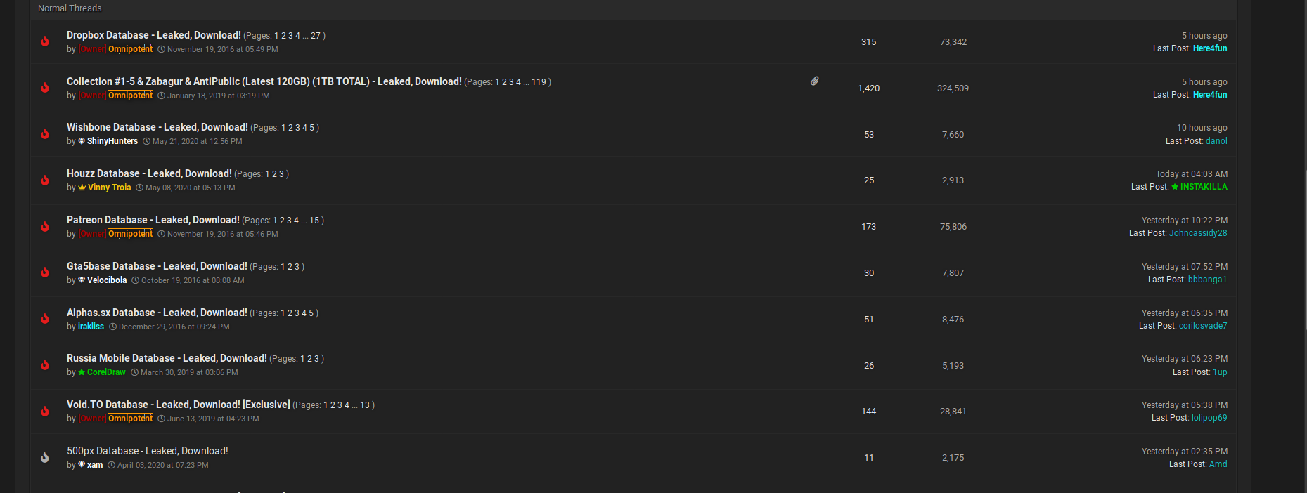 Это отработка ещё раз говорю, которая качует по всем форумам с лозунгом алая забугор топ бд и т.д,. Хочешь, можешь конечно собирать, если места на диске не жалко, только толку мало 1. дроб бокс был слит ещё в 2019 году если не в 18 2. коллекции хрен пойми чего, из гавна и палок что-то собраное 3. Wishbone уже месяц в пабе валяется, хрен пойми сколько в привате шаталась. 4.Patreon.com тоже самое , ещё и бкрипт хэш, поэтому наверное и в пабе. 5.Gta5base.com 5к база, "солидно" 6.Тоже самое что и пункт 5 только ещё и бкрипт 7. Номера телефонов можно самому сделать, масками . Ничего интересного, тут кстати люди запотели по регионам ещё сделали. 8.Void.to тоже старое. 9.500px уже говорил. Прежде чем думать, что выложили свежак, зайди посмотри вот тут хотя бы https://hashes.org/leaks.php, то что валяется на этом сайте уже старье, vkmix.com лично сливал 3-4 месяца назад, так кстати не полная бд, она около 4кк юзверей примерно , остальное боты, а дамп появился 1- 1.5 недели назад