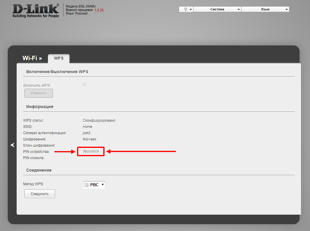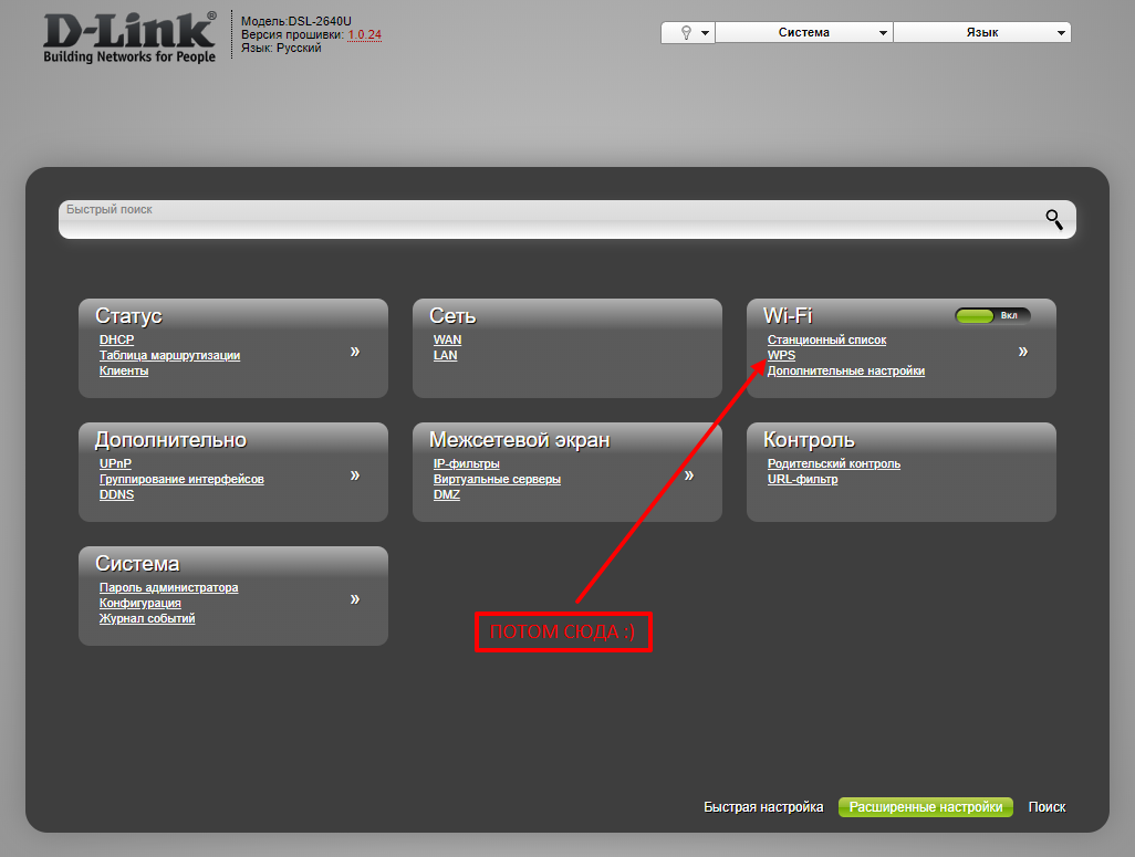 Так говорю же, что захожу, а где там WPS-пин - найти не могу. Модель D-Link DSL-2640U UPDATE Извиняюсь, нашел, где там спрятался пин WPS