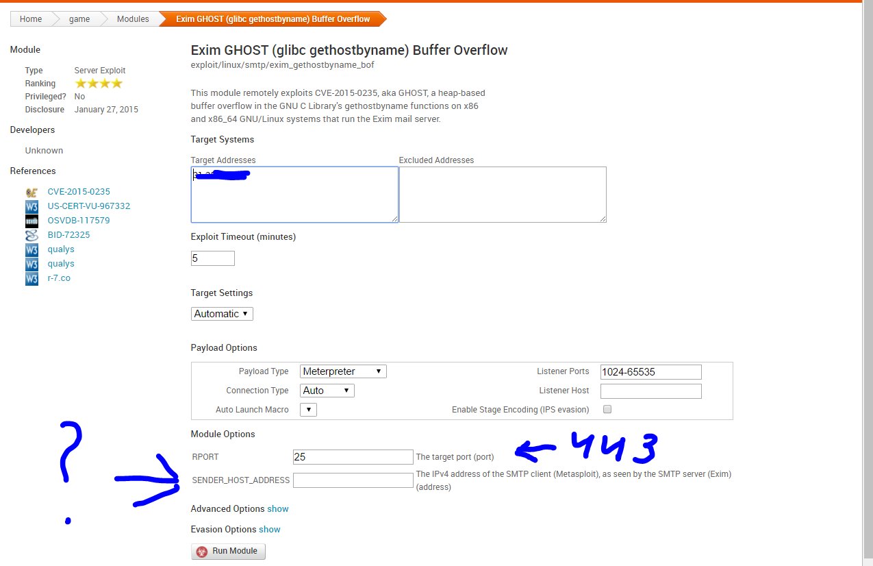 Во-первых: что ты собрался ломать если открыты только порты веб-сервера? Там нет никакого exim'а, соответственно применить этот эксплоит некчему. Даже если на сервере и открыт 25 порт, то не факт что там стоит exim а не postfix, например. Для начала нужно приконнектиться на 25 порт и посмотреть что там за почтовый сервер. Нет никакого смысла пытаться применять сплоит если видно что там стоит какой-либо другой сервер отличный от ексима.